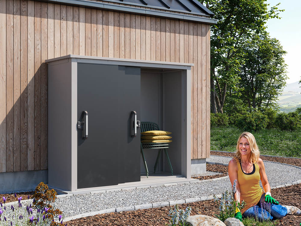 Anstelle von ausschwingenden Flügeltüren kommt eine Dreifach-Schiebetür zum Einsatz. Sie öffnet den Geräteschrank über nahezu die gesamte Frontbreite, ohne weiteren Platz davor zu beanspruchen. Besonders auf schmalen Wegen oder bei dicht nebeneinander stehenden Hochbeeten bleibt der Durchgang somit frei. Das integrierte Zylinderschloss blockiert die Türen zuverlässig gegen ungewolltes Öffnen und schützt die verstauten Gegenstände vor Diebstahl oder neugierigen Tieren.