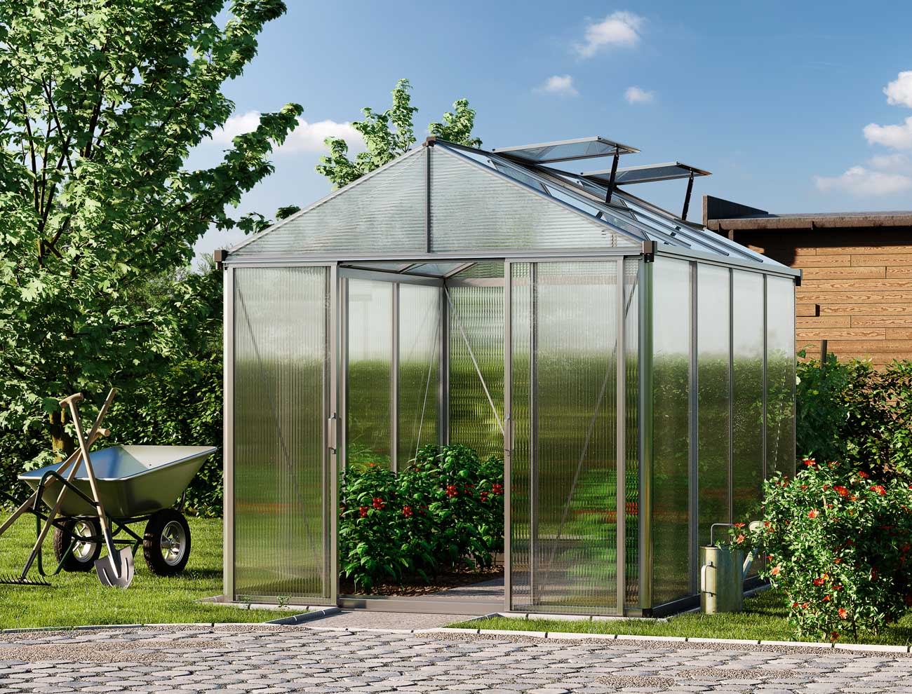 Für ein ausgewogenes Innenklima wurden zwei Dachfenster ab Werk integriert. Aufstellbare Fenster verringern Hitzestau im Sommer und senken die Luftfeuchtigkeit nach starkem Gießen, was Pflanzenkrankheiten vorbeugt. Eine 120 cm breite Doppelschiebetür ermöglicht nicht nur einen komfortablen Zugang, sondern schafft bei Bedarf einen zusätzlichen Luftaustausch in Bodennähe. Durch die Schiebefunktion bleibt wertvoller Innenraum erhalten, denn Türflügel schlagen nicht in die Beete aus.