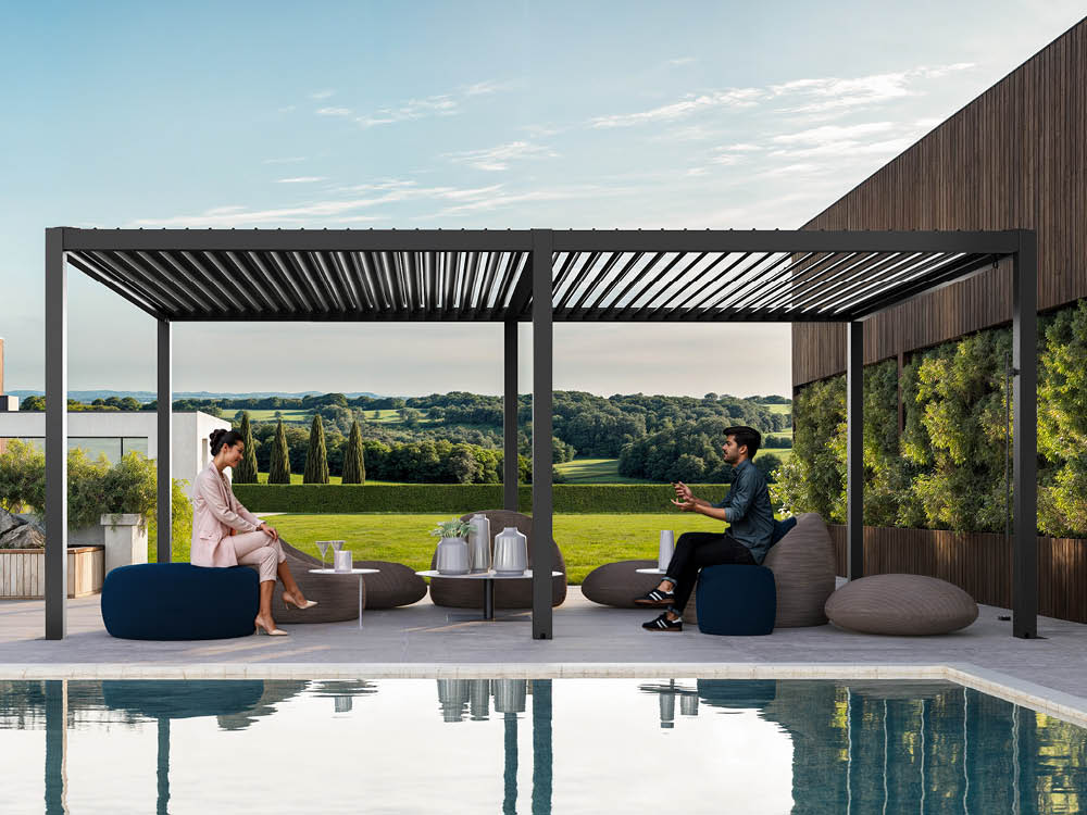 Die Pergola fungiert nicht allein als Regenschutz, sondern erweitert den Wohnraum ins Freie. Im Zusammenspiel mit mobilen Seitenmarkisen entsteht ein nahezu geschlossener Outdoor-Raum, der windabgewandt ist. LED-Streifen an den Querbalken sorgen für stimmungsvolle Beleuchtung bei Abendgesellschaften. Kombiniert mit wärmespeichernden Infrarot-Heizstrahlern lässt sich die Terrassensaison bis weit in den Herbst hinein verlängern.